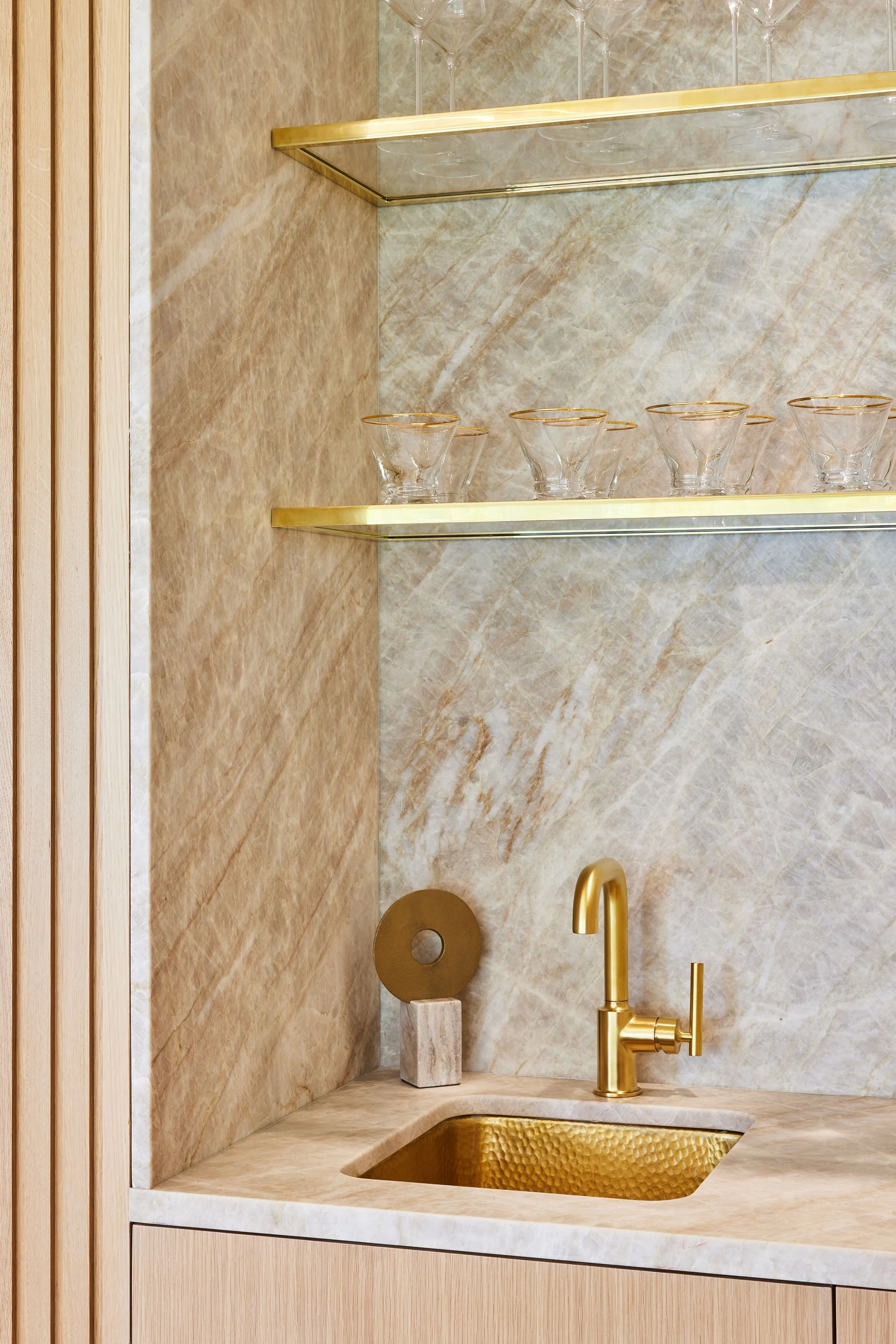 The adult space at hand was once a ground floor underused cold sunroom and dark home office - neither large enough to accommodate the family’s needs. Combining to two rooms involved negotiating different ceiling and floor heights to establish one cohesive space, while carefully considering the exterior changes as they related to the view from the street. The result is a light drenched ‘jewelry box’ space, finished in earthy tones to echo their love for the beaches and houses of Nantucket. Gold and white accents along with a small wet bar add a sophisticated touch for entertaining and quiet relaxation. The compact powder room acts as a hidden extension of the space, with warm wood paneling and a custom stone sink.